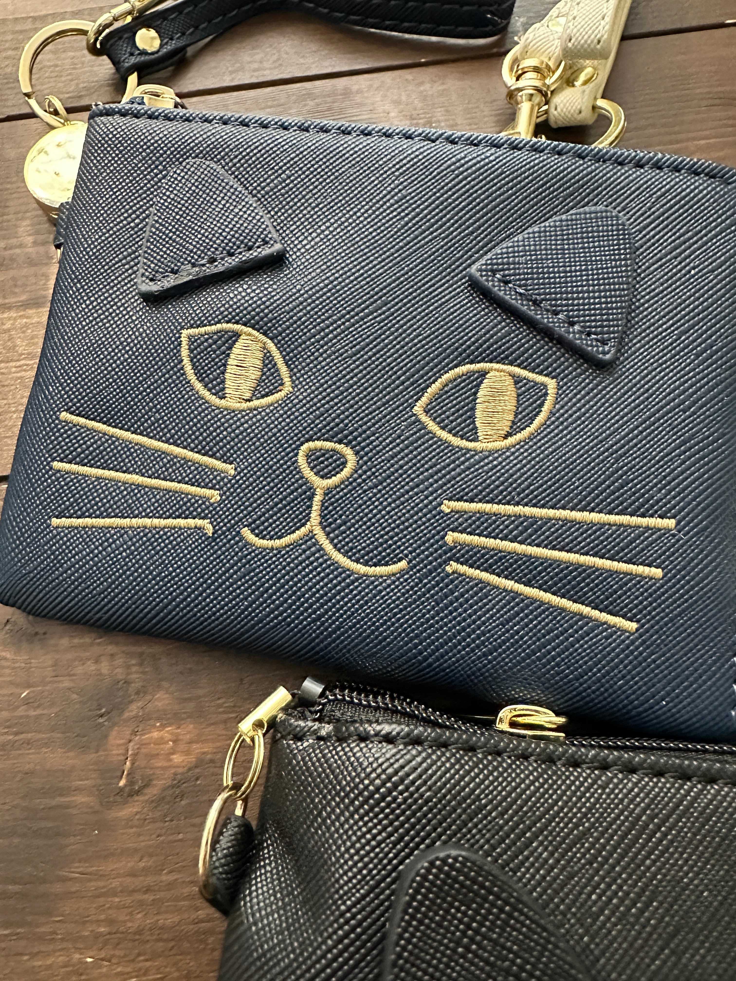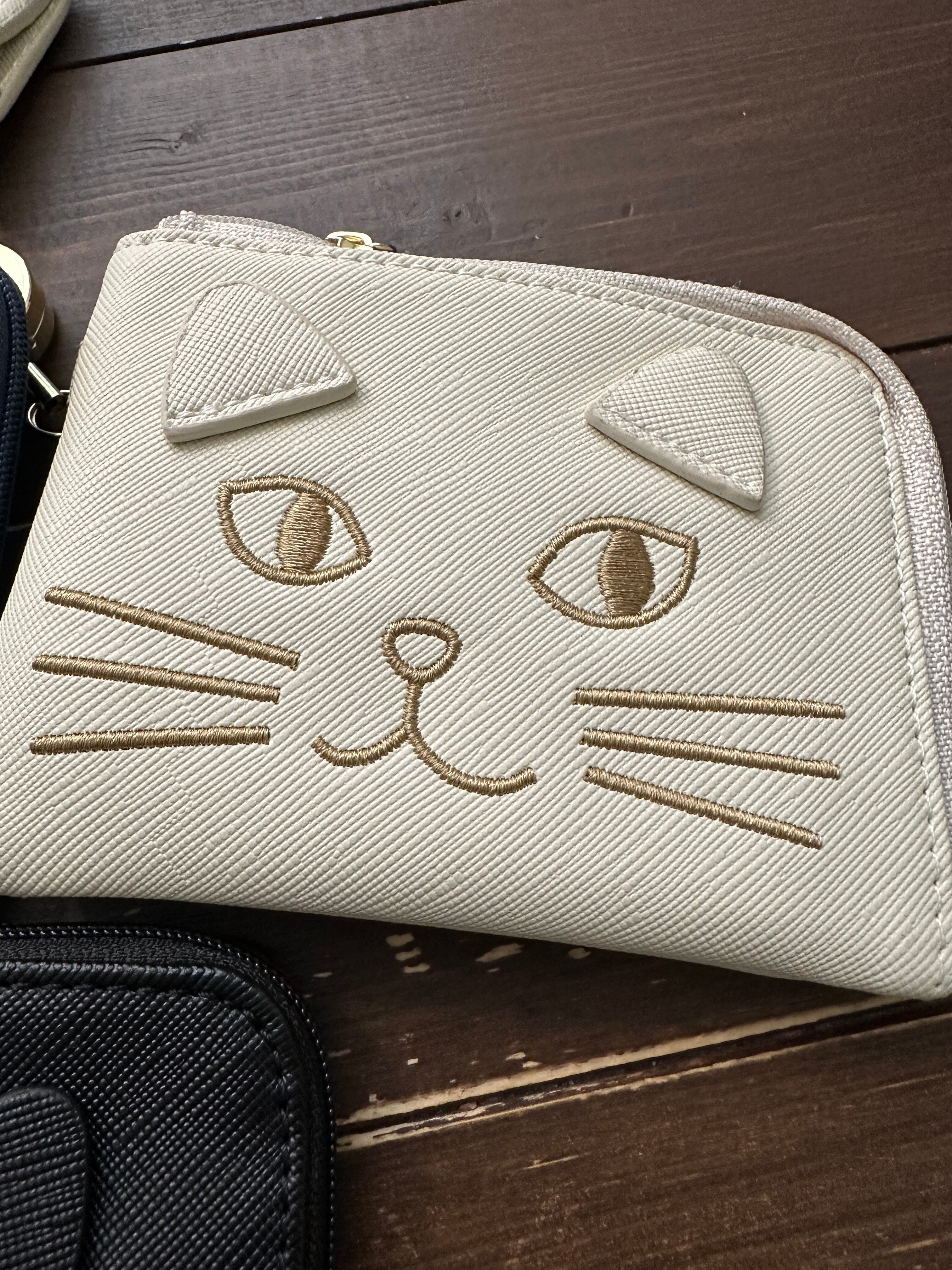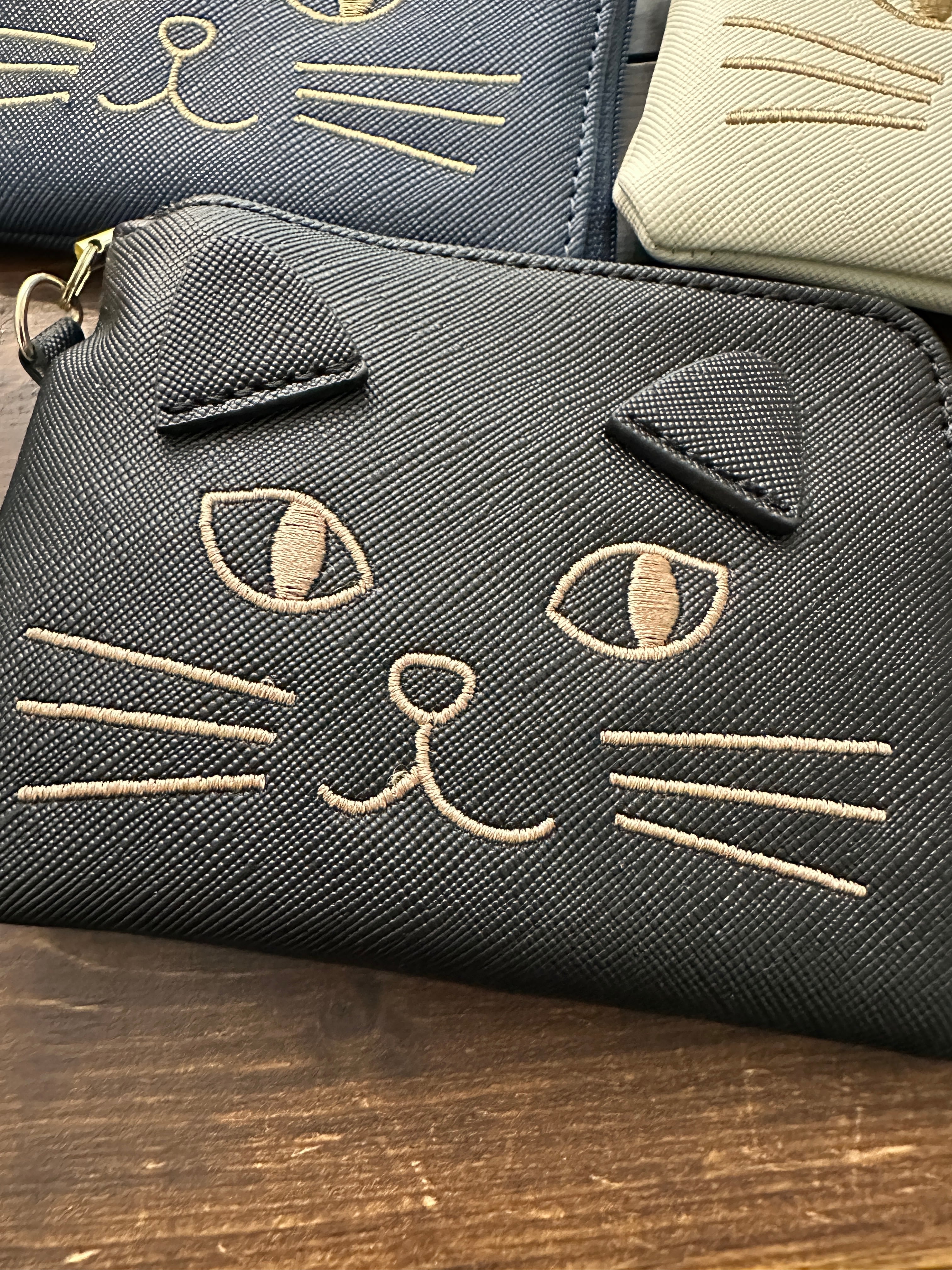 愛らしい猫の刺繍と立体的な耳が目を引く、大人可愛いミニポーチ。